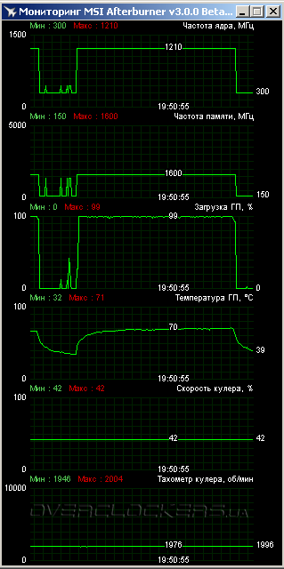 Такой разгон вполне реализуем в тихом режиме. Мы специально понизили скорость вентиляторов до 42% и температура ядра все равно не превысила 68–71 °C. Отличный результат!