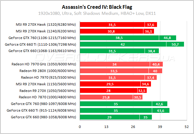 В Assassin’s Creed 4 простая версия Radeon R9 270X уступает GeForce GTX 660, карта от MSI держится на одном уровне с соперником. Разгон не дает существенного прироста, но позволяет сравняться с Radeon HD 7970.