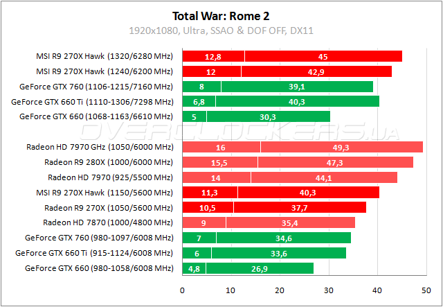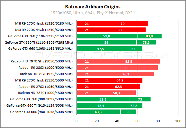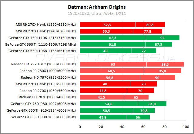 В Arkham Origins у AMD позиции чуть лучше и Hawk изначально сопоставим с GTX 660 Ti. Нагнать старшие карты повышение частот не помогает.