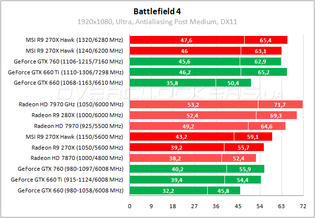 Мизерное отставание референсного R9 270X от GTX 760 в Battlefield 4. Hawk быстрее собрата на 6–10%. Разгон в тихом режиме дает прирост 7%, максимальный разгон позволяет выиграть еще 3–4%.