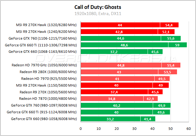 Обе версии Radeon R9 270X одерживают вверх над GeForce GTX 660 в Splinter Cell, но уступают GTX 660 Ti. Разгон до 1320/6280 МГц позволяет Hawk вплотную приблизиться к уровню производительности GeForce GTX 760.