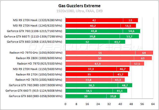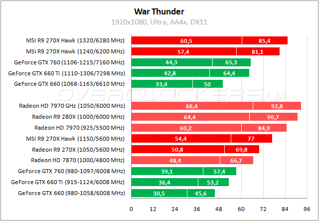 У простого Radeon R9 270X и Hawk разница в 7%. Герой обзора уступает GeForce GTX 660 Ti менее 1%. Разгон позволяет выйти на один уровень производительности с GeForce GTX 760.