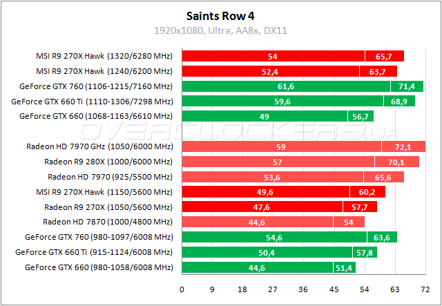 GeForce GTX 660 Ti удерживает скромное преимущество над Radeon R9 270X в Saints Row 4, но уже проигрывает видеоадаптеру MSI. Максимальный разгон позволяет Hawk сравняться с Radeon HD 7970.