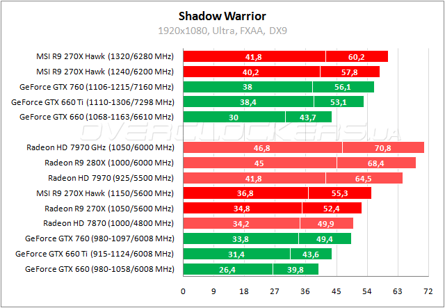 Игра Shadow Warrior отодвигает графические ускорители NVIDIA на последние места. Даже Radeon HD 7870 имеет хоть и мизерное, но преимущество относительно GeForce GTX 760. Между Radeon R9 270X и Hawk разница не более 6%. Разгон в тихом режиме дает прирост 5–9%, еще 4% удается выжать при разгоне на максимальном напряжении.