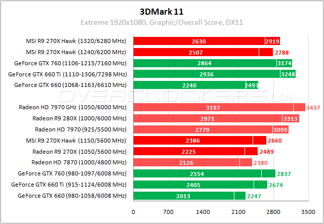 В этот раз в противостоянии R9 270X и GTX 660 Ti небольшой перевес на стороне первого. MSI Hawk проигрывает 3–4% GeForce GTX 760. Разница между разгоном в тихом режиме и максимальными частотами на уровне 3–5%.