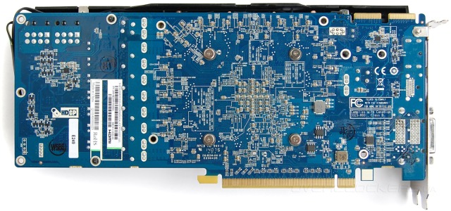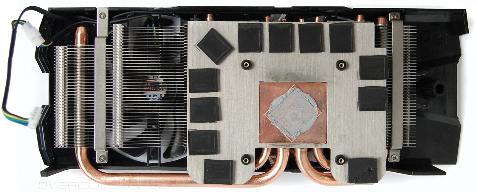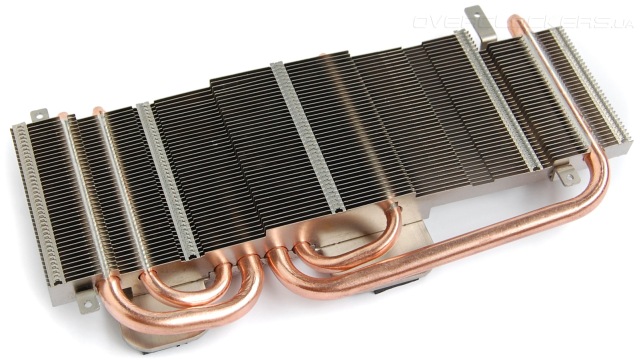 Взглянем на систему охлаждения поближе. Тепло от графического процессора отводится через медную площадку и четыре тепловые трубки. Эта площадка окружена массивной пластиной, контактирующей с чипами памяти через термопрокладки.