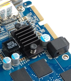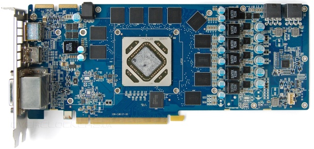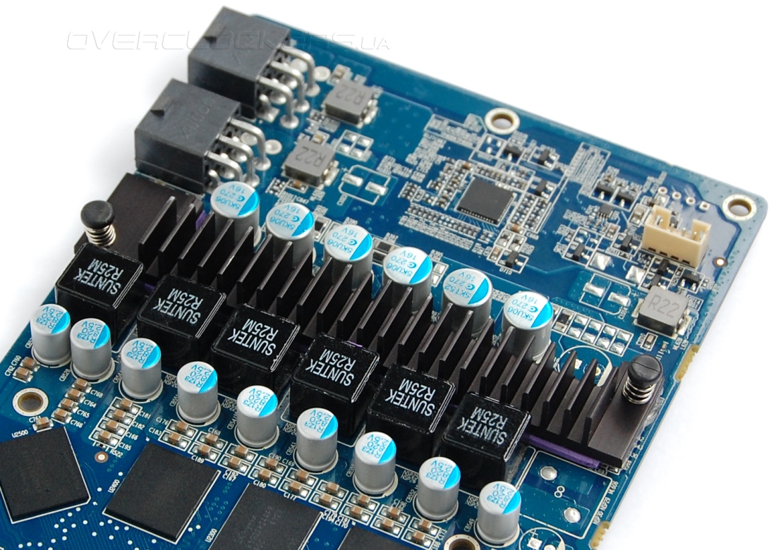 Процессора запитан от пятифазного преобразователя. Каждая из фаз реализована на интегральных сборках DrMOS. Есть пустые места и под шестую линию. Возможно, более полная версия такой PCB идет для R9 280X. Управляющие функции возложены на контроллер NCP 4206.