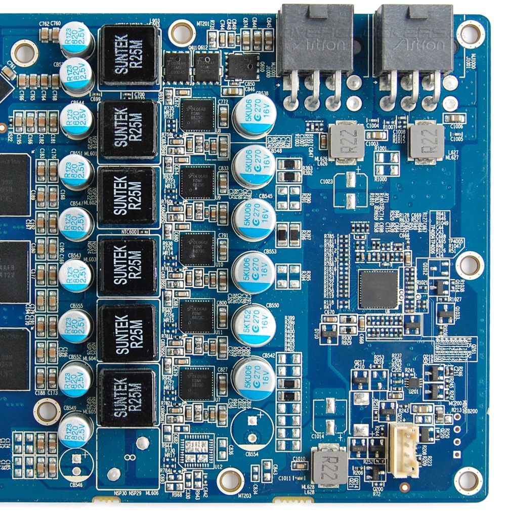 Плата типового для Sapphire синего цвета. Питание подключается к двум шестиконтактным разъемам.