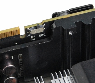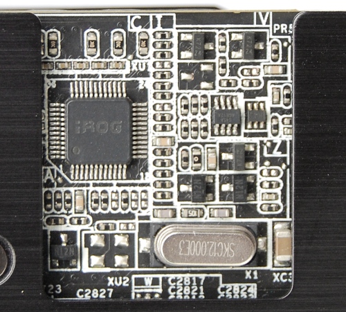 Свободной оставлена площадка, на которой распаян контроллер iROG с кварцевым резонатором. У разъема CrossFire имеется переключатель микрокода карты. У Matrix два BIOS, что позволяет экспериментировать с прошивками без боязни вывести видеокарту из строя. Частотные характеристики у стандартных прошивок одинаковые.