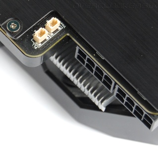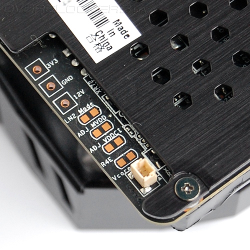 В зонах по краям платы расположены контакты VGA Hotwire. Соединив небольшие разъемы комплектными кабелями с соответствующими контактами на системной плате ASUS серии Republic of Gamers, пользователь получает возможность аппаратного контроля основных рабочих напряжений через UEFI BIOS платы или через утилиту ASUS Ai Suite в среде Windows. Хотя у Matrix отлично работает программный мониторинг и куча параметров регулируется через ASUS GPU Tweak без какой-либо дополнительной коммутации карты с материнской платой. Управление через VGA Hotwire активируется по замыканию двух контактных площадок R4E. Замыкание LN2 Mode снимает защиту от высокого напряжения. Контакты ADJ MVDD и ADJ VDDCI зарезервированы для ручного управления напряжением памяти и GPU при подборе шунтирующего сопротивления.