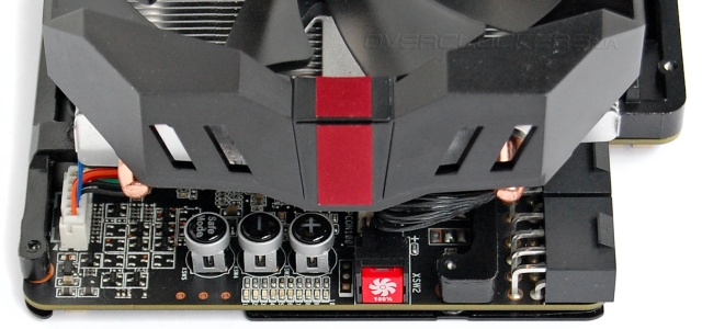 На лицевой стороне, у края платы, расположено несколько кнопок. Красная активирует скоростной режим вентиляторов, мгновенно выводя их обороты на 100%. Кнопки обозначенные «–» и «+» позволяют регулировать напряжение GPU. А если что-то пошло не так, можно произвести аппаратный сброс и вернуться к исходным настройкам BIOS по нажатию кнопки Safe Mode. Хотя над кнопками и нависает кулер, но доступом к ним не вызывает проблем.