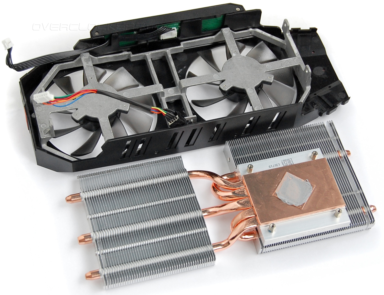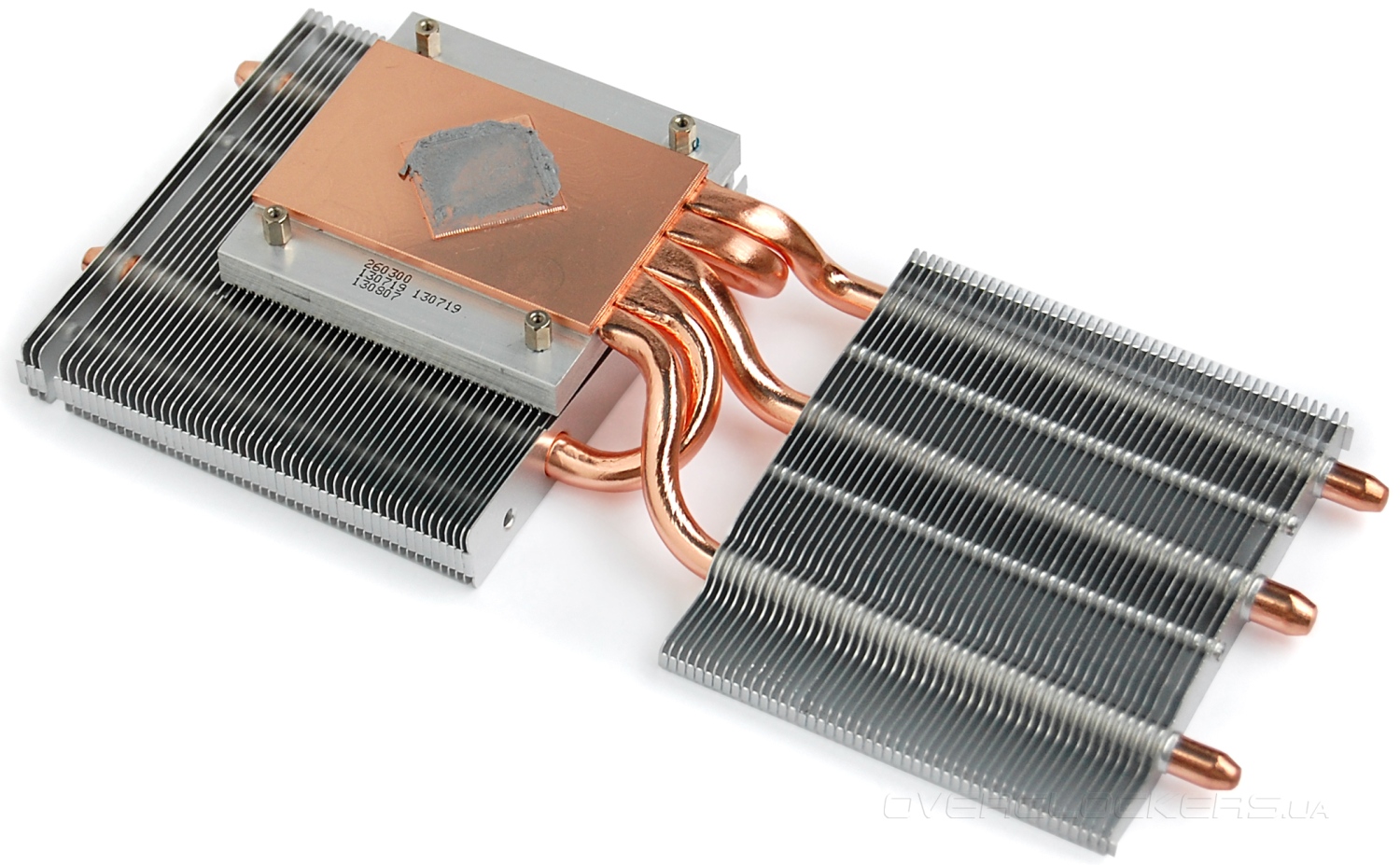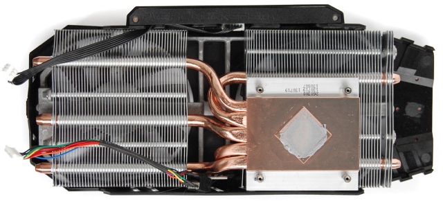 Система охлаждения ничем не отличается от той, что устанавливается на ASUS Matrix-HD7970-P-3GD5 — массивное медное основание, пять тепловых трубок, двухсекционный радиатор. Такое охлаждение используется во всех трехслотовых видеокартах ASUS, с небольшими вариациями по количеству трубок и типу основания.