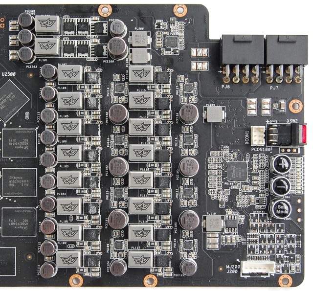 Рассматриваемый Matrix может похвастать 20-фазным питанием, 16 фаз из которых приходится на графический процессор. У референса, напомним, лишь шестифазный стабилизатор напряжения GPU. Управляющие функции возложены на ШИМ-контроллер с маркировкой Digi+ ASP1211. Используются высококачественные электронные компоненты с улучшенными рабочими характеристиками и повышенным сроком службы.