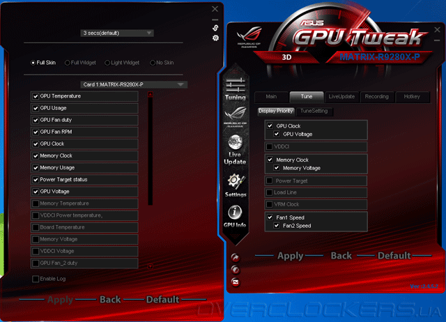 Рабочее напряжение равно 1,256 В, что соответствует таковому у старого Matrix. Да и в целом, для обычных версий Radeon HD 7970 GHz Edition это нормальное рабочее напряжение, хотя и необоснованно завышенное, о чем мы не раз упоминали. Говоря о напряжениях, нельзя не упомянуть о высоком функционале видеокарты. Через утилиту ASUS GPU Tweak для отслеживания и контроля доступно неимоверное количество параметров. Их список так велик, что даже не помещается на одном скриншоте. Есть отслеживание напряжений и температур чипов памяти, узла питания, платы и дополнительные тонкие настройки вроде Load Line Calibration и VRM Clock. Даже скорость вентиляторов можно регулировать раздельно.