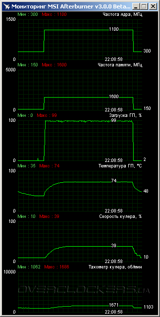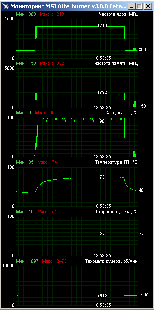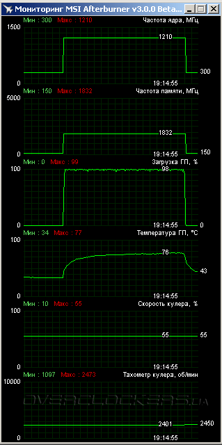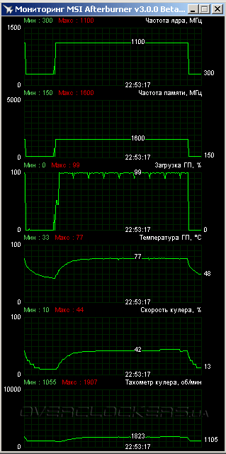 Зато под такой разгон не понадобилось сильно накручивать рабочее напряжение — 1,269 В обеспечили стабильность карты в игровых тестах. Вентиляторы были ускорены до 2450 об/мин при помощи ручных настроек.