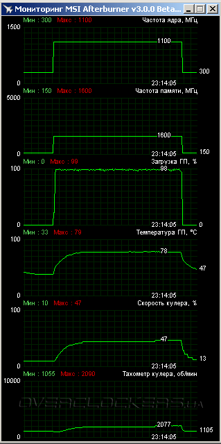 Для иллюстрации рабочих температур ядра и скорости вентиляторов мы воспользуемся показаниями более привычного MSI Afterburner. По итогам 12-минутного прогрева Crysis: Warhead (демо Ambush) и Unigine Valley benchmark в разрешении 2560x1440 на максимальных настройках качества ядро прогрелось до 77 °C и 79 °C при 23–24 °C в помещении. Скорость вентиляторов достигала 1800–1900 об/мин в более простом приложении и чуть более 2000 об/мин в Valley benchmark. Уровень шума средний.