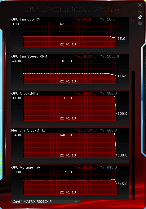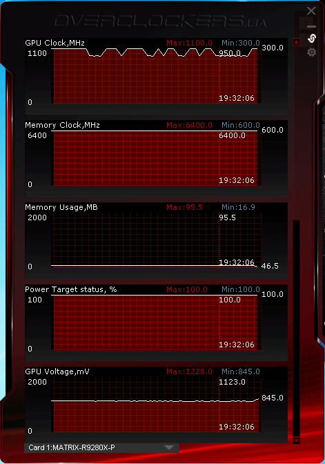 В рабочих частотах у нового Matrix Platinum есть небольшие отличия от предшественника. Если HD7970-P-3GD5 работал на 1100/6600 МГц, то R9280X-P-3GD5 функционирует на 1100/6400 МГц. Таким образом, поддерживается тенденция, когда новые Radeon R9 280X чуть-чуть не дотягивают по частотам до старших версий Radeon HD 7970 GHz Edition. Но это «чуть-чуть» легко компенсируется дальнейшим разгоном. Еще нужно сказать, что базовая частота у ядра 950 МГц, что на 100 МГц ниже таковой у HD7970-P-3GD5. Впрочем, при обычной игровой нагрузке ядро всегда работает на частоте Boost, а до базового значения замедлить его могут только стресс-тесты. Промежуточных значений Boost у Tahiti нет, так что можно смело говорить о 1100 МГц в играх.