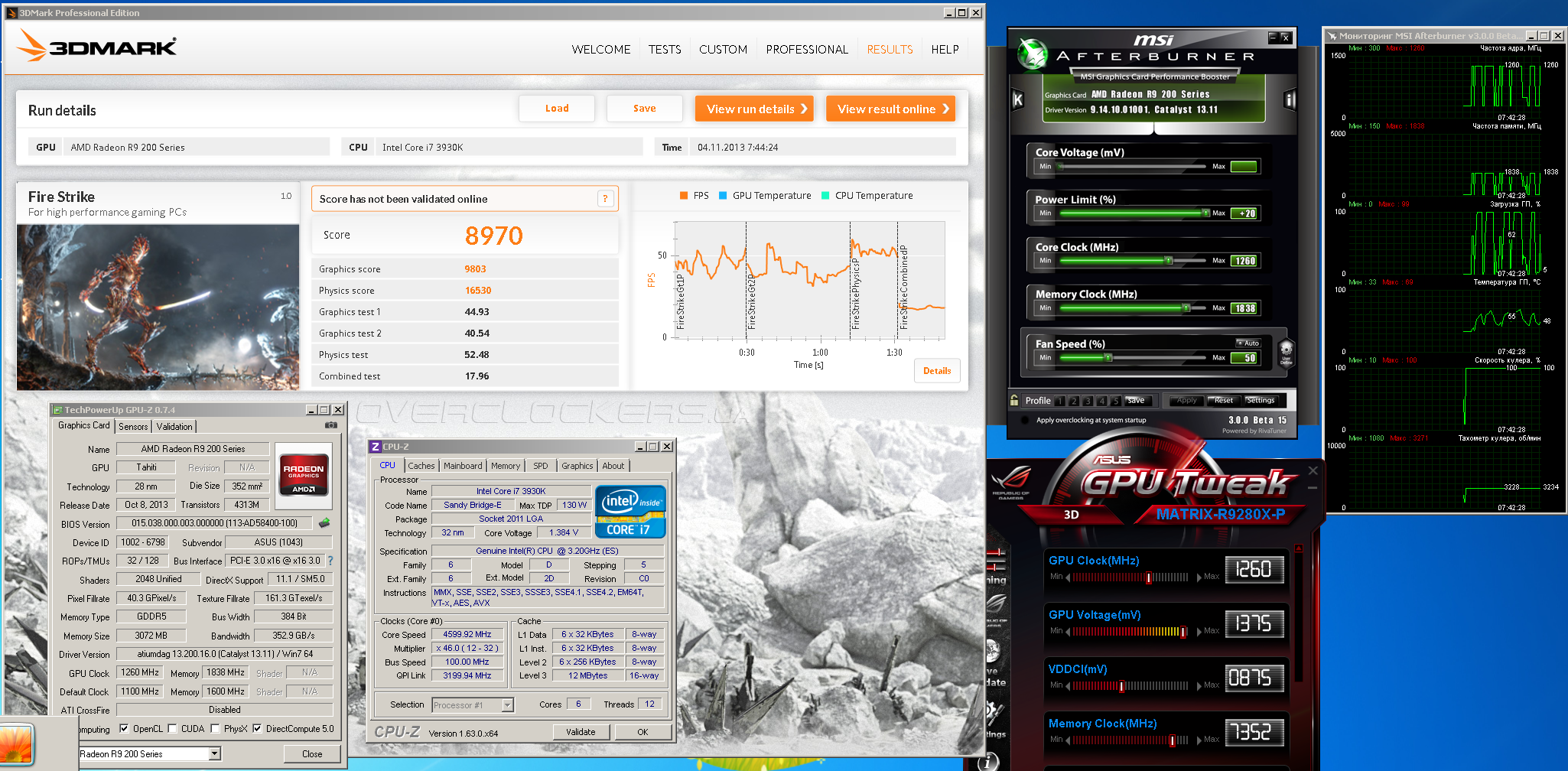 Если же говорить о потенциале для бенчмарков, то нам удалось пройти 3DMark FireStrike в разрешении 1920x1080 при частотах 1260/7352 МГц.