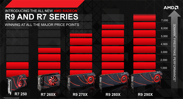 Даже система наименования видеокарт была изменена, что должно символизировать о начале новой эры Radeon. Отчасти это связано и с тем, что в OEM-сегменте уже присутствовали переименованные версии старых карт в виде Radeon HD 8000, что могло бы привнести сумятицу. Анонсированные модели поделены на две серии — Radeon R7 и Radeon R9. Видеокарты с бóльшим индексом принадлежат к high-end сегменту игровых решений, а карты с меньшим — к сегменту мейнстримовых решений. В таком разделении есть некоторые аналогии с нынешней градацией APU, которые делятся на линейки A6, A8 и A10. После буквенно-цифрового индекса в названии идет трехзначный номер, первая цифра которого указывает на поколение видеокарты, а две последующие — на рейтинг производительности. Примечательно, что новые видеокарты сразу же берут отсчет с номера 2xx, что указывает на второе поколение. Смена маркировки явно была бы более уместной на момент анонса самых первых решений на базе новой GCN-архитектуры. На первых порах новая маркировка будет вводить потребителя в замешательство, но со временем все освоятся. Тем более, что в плане позиционирования новая система даже в чем-то проще. Это, как сравнение процессоров Intel Core i3 и Core i5 — даже без знания конкретного номера и характеристик покупатель уже понимает, что продукты из разных категорий.