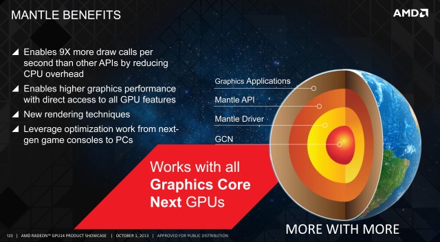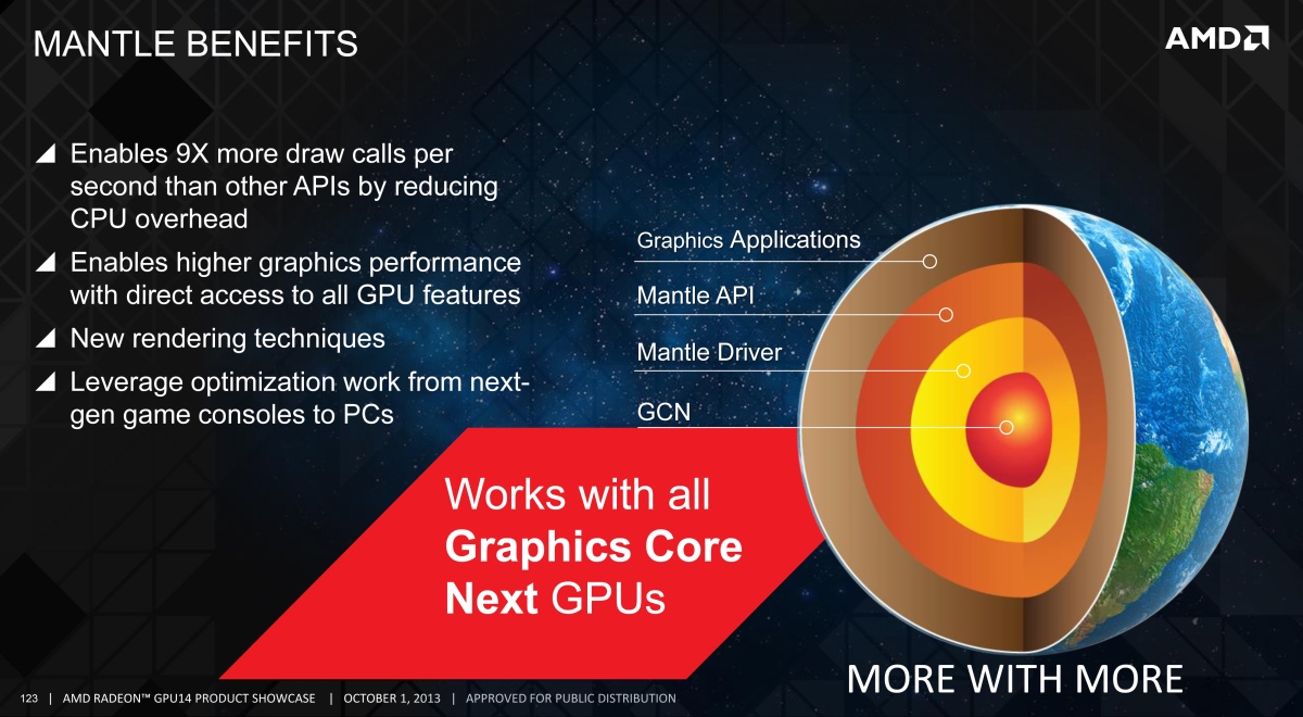 Все новые Radeon обзавелись поддержкой DirectX 11.2. В свете использования старых GPU это обновление исключительно программное. Сам же API работает в среде Windows 8.1. Намного больший интерес вызывает новый анонсированный API Mantle, который рассчитан для работы с GPU Radeon на низком уровне. Он создавался с целью обеспечить наибольшую производительность (благодаря прямому доступу к аппаратным ресурсам GPU) и простоту разработки для разных игровых платформ. В качестве сравнительных цифр можно озвучить девятикратное преимущество по скорости вызова отрисовки (Draw Calls) относительно DirectX. При этом разработчики могут работать с Mantle на любом устройстве архитектуры GCN, что максимально упрощает разработку игр под разные платформы. Проект очень амбициозный и перспективный, но не совсем понятно, рассматривается ли он как полная альтернатива DirectX или как вспомогательный API. Детали станут ясны по итогам AMD Developer Summit, который пройдет в ноябре.