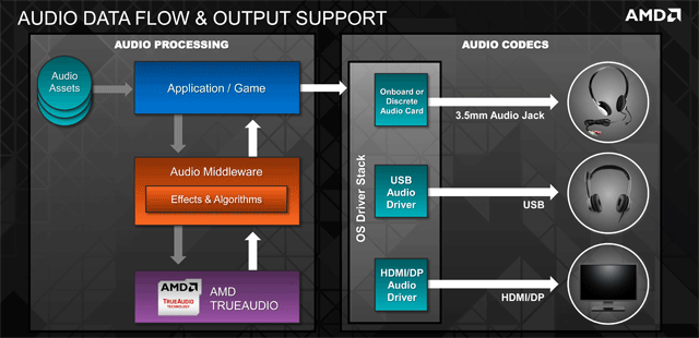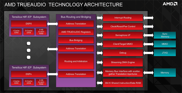 Еще одно необычное начинание AMD — TrueAudio. В свое время Microsoft с выпуском операционной системы Vista поставила крест на аппаратной обработке звука. Технология TrueAudio призвана изменить ситуацию. В составе новых GPU есть свой звуковой процессор, насчитывающий несколько DSP-ядер Tensilica HiFi EP Audio DSP и блок управляющей логики. Аудиопроцессор имеет 384 КБ встроенной памяти и может адресовать до 64 МБ видеоапамяти.