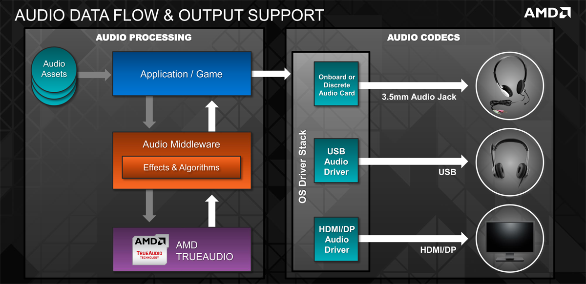 Разработчики получат доступ к базовым функциям AMD TrueAudio через специальный API, что позволит создавать какие угодно звуковые эффекты. Ведется сотрудничество с разработчиками программного обеспечения в данной сфере. В частности, новая технология поддерживается звуковым движком Audiokinetic Wwise, который является специальным инструментарием для игровых разработчиков. Под него уже имеются специальные плагины с пространственными звуковыми эффектами AstoundSound, разработанными GenAudio.
