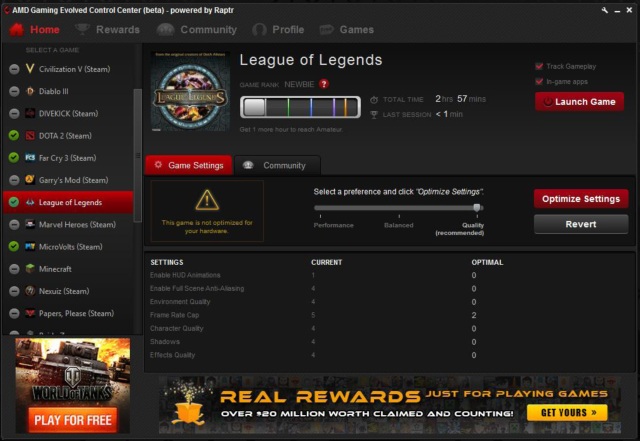 Вместе с запуском нового поколения видеокарт AMD выпустила свой ответ на GeForce Experience. Последняя программа обеспечивает автоматический подбор графических настроек для обеспечения оптимальной производительности при наилучшем качестве графики на системах с картами NVIDIA. Программа AMD Gaming Evolved App делает тоже самое на Radeon. Сервис интегрированный в социальную сеть для геймеров Raptr и база профилей формируется на основе пользовательских конфигураций, которые проходят предварительный контроль. И в отличие от GeForce Experience сервис AMD предлагает три профиля для каждого приложения в своей базе — Performance, Balanced, Quality.