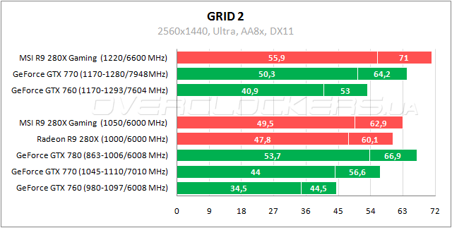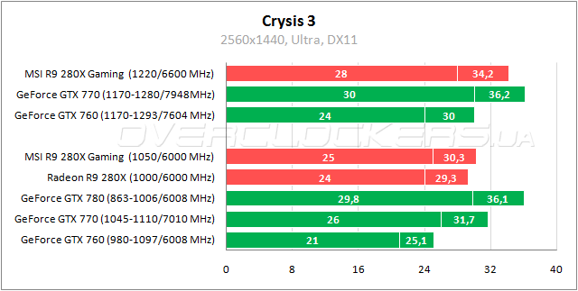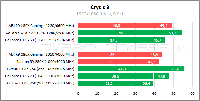 Можно говорить о примерном равенстве Radeon R9 280X и GeForce GTX 770 в Warhead — один чуть лучше по минимальному параметру, второй по среднему. У MSI Gaming преимущество в 2–3%. Разгон позволяет приблизится к результатам GeForce GTX 780.