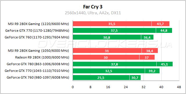 Radeon R9 280X в Far Cry 3 демонстрирует преимущество над GeForce GTX 760 в 18–20%, не дотягивая 6–8% до уровня GeForce GTX 770. Преимущество MSI над референсом менее 4%, разгон дает прирост в 14–15%.