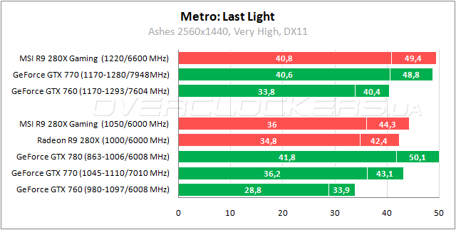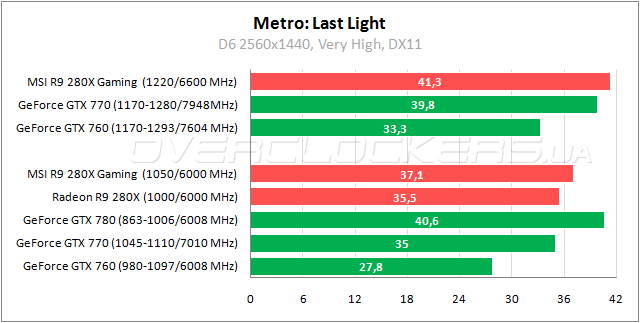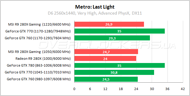 В родном бенчмарке Metro: Last Light представитель AMD уже немного обошел GeForce GTX 770 на заводских частотах. Но разница вновь минимальная.
