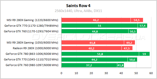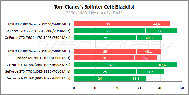 В Splinter Cell Radeon R9 280X на 16–17% обгоняет GeForce GTX 760 и не дотягивает 4–8% до уровня GeForce GTX 770. Преимущество MSI над собратом менее 4%. Разгон позволяет поднять производительность еще на 11%.