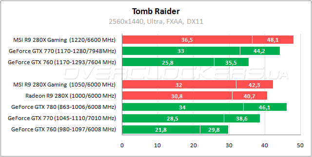 В Tomb Raider новый Radeon обходит GeForce GTX 770 на 5–8%. От GeForce GTX 780 его отделяют 10–13%, что легко компенсируется разгоном до 1220/6600 МГц.