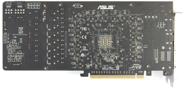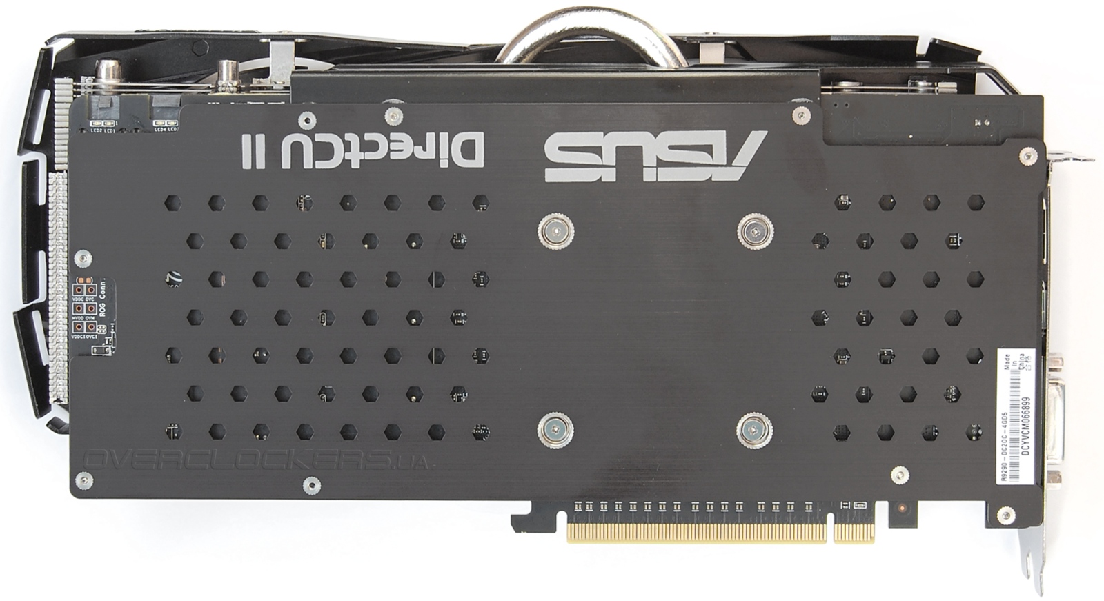 Обратная сторона платы закрыта перфорированной металлической пластиной. Отсутствуют разъемы для соединения видеокарт мостиком CrossFireX — новые Radeon отлично работают в паре без дополнительных аппаратных интерфейсов.