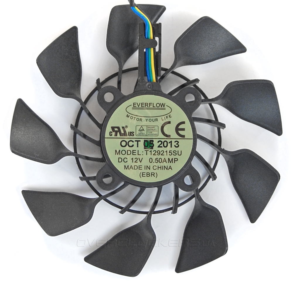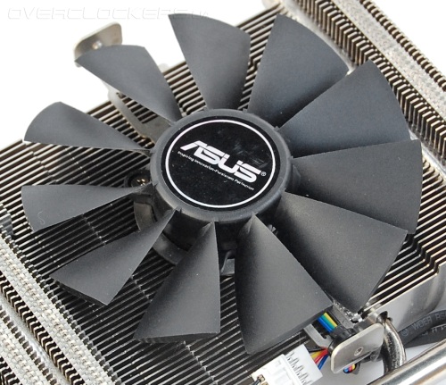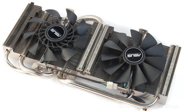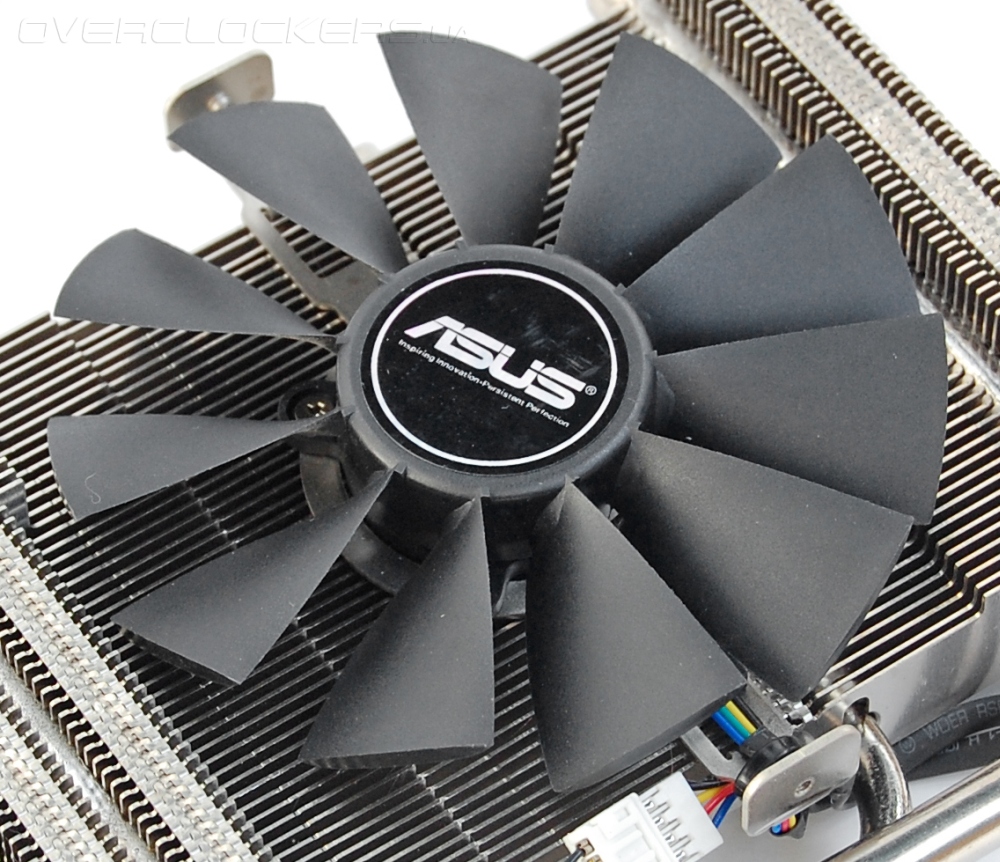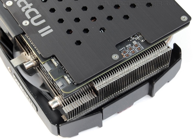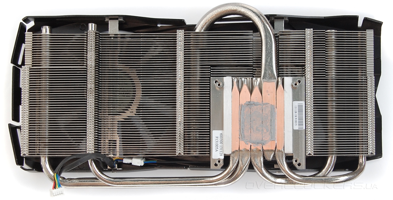 Конструкция кулера не отличается от охлаждения упомянутой выше карты ASUS R9280X-DC2T-3GD5. В основе пять тепловых трубок — две диаметром 6 мм, две по 8 мм и одна 10 мм. Боковые трубки, самые тонкие, напрямую с графическим кристаллом на контактируют, что хорошо видно по отпечатку термопасты.