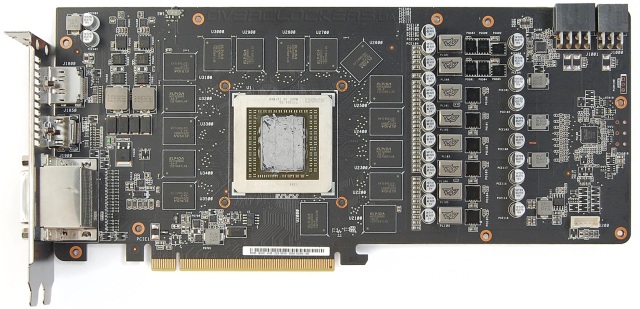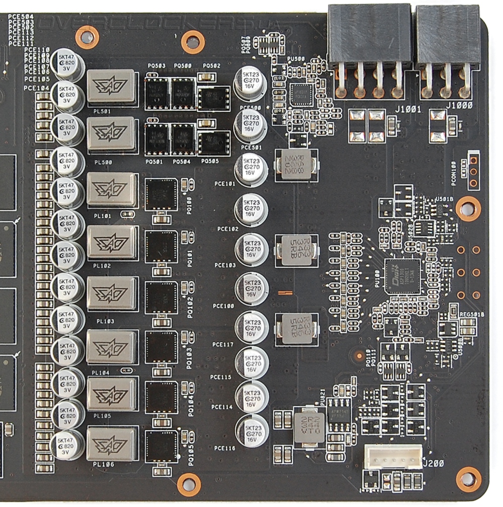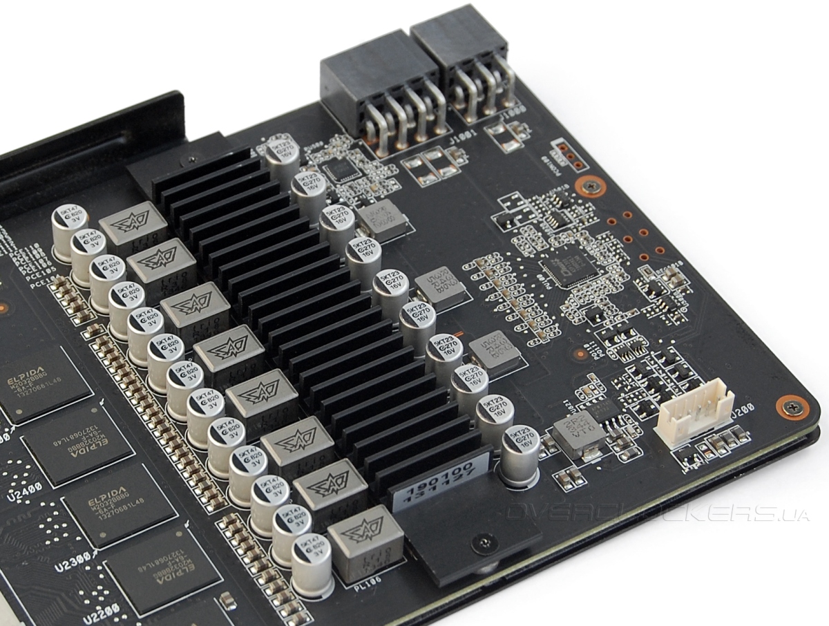 Непосредственно ядро запитано от шестифазного преобразователя под управлением контроллера DIGI+ ASP1300. Память запитана от двух фаз. У старших Radeon R9 290X референсного дизайна питание реализовано по схеме 5+1.