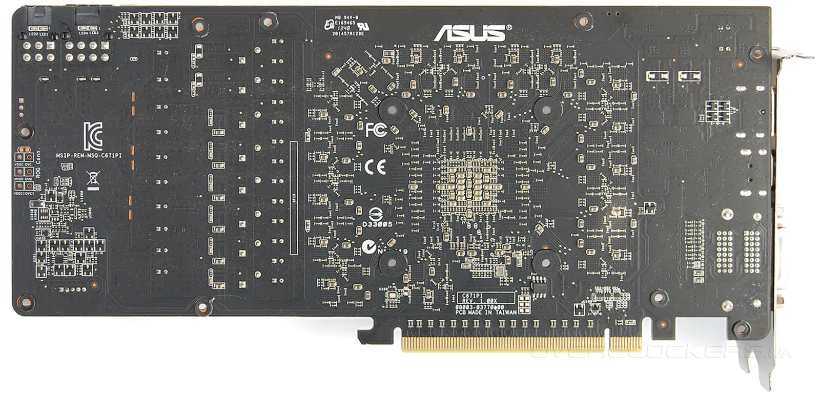 Дизайн платы напоминает ASUS R9280X-DC2T-3GD5, фаз питания даже немного меньше, зато используются силовые модули DrMOS. В левой части платы имеется маленький переключатель BIOS.