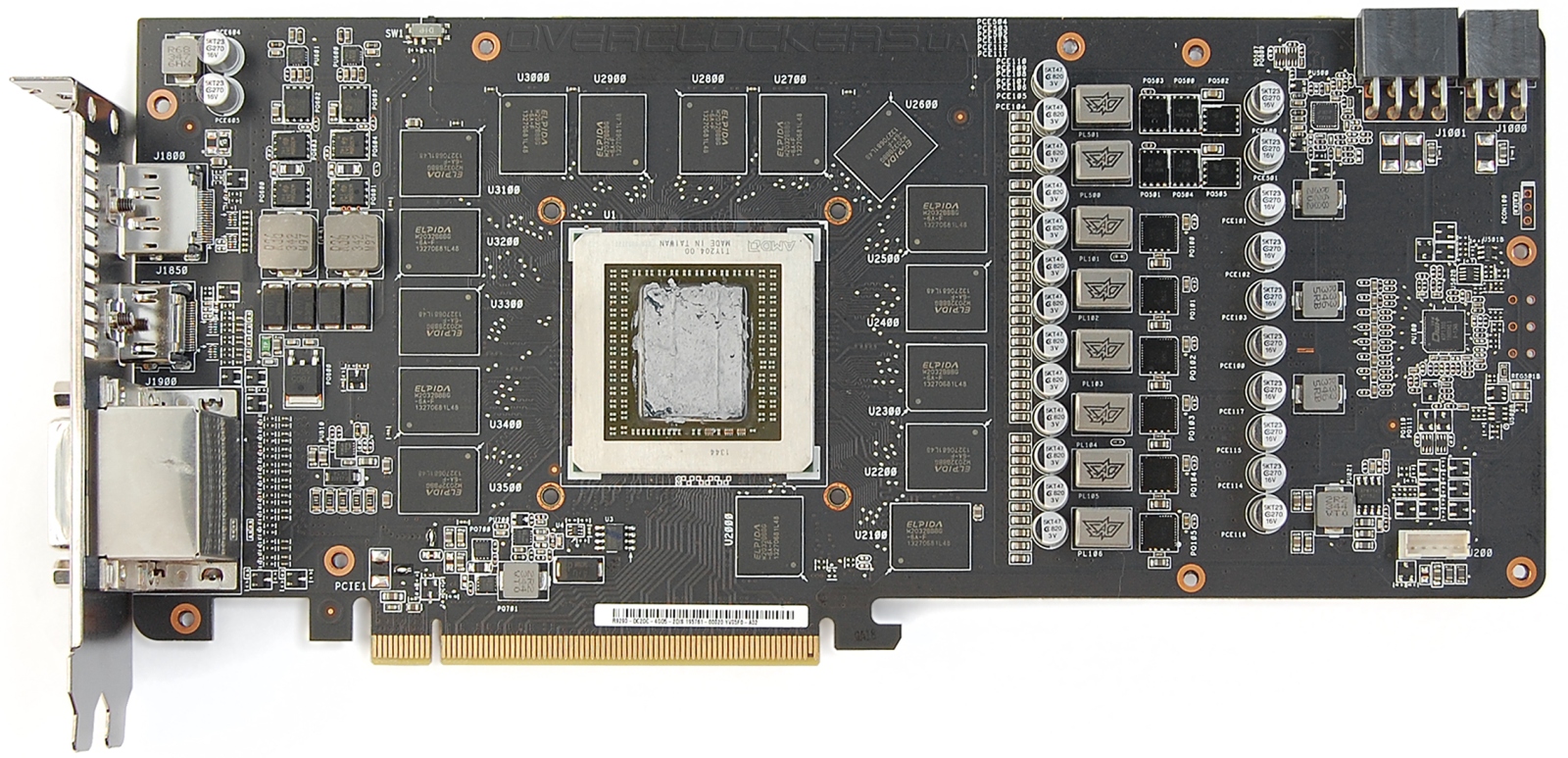 Одним из важным преимуществ топовых Radeon относительно конкурентов от NVIDIA является большой объем памяти в четыре гигабайта. В данном случае они набраны 16 микросхемами Elpida W2032BBBG-6A-F.