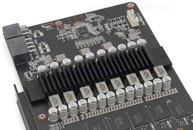 На силовых компонентах узла питания имеется небольшой ребристый радиатор. Честно говоря, от топового продукта ожидаешь чего-то более солидного. Хотя на Radeon HD 7970 и GeForce GTX 680 от ASUS были такие же радиаторы, что не мешало им демонстрировать хороший разгон.