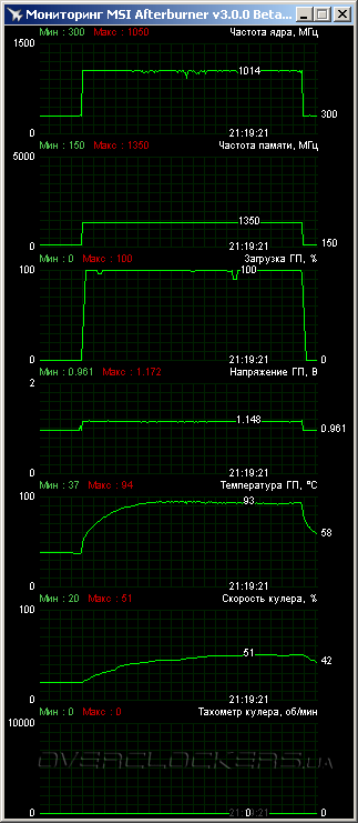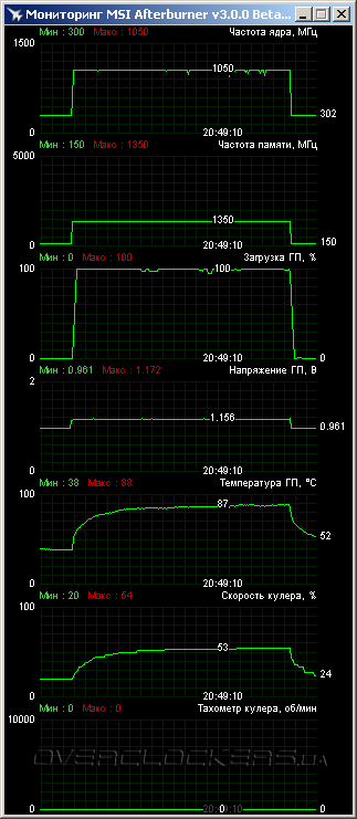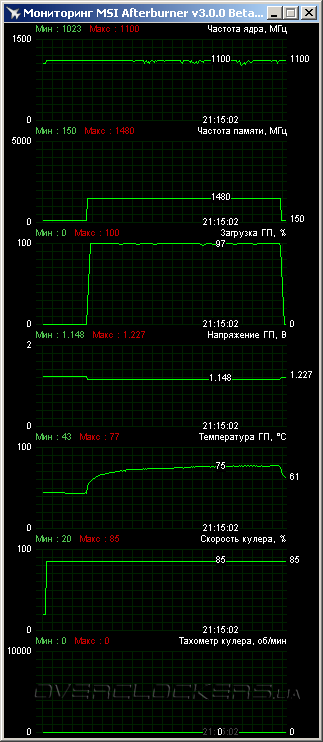 Небольшой вроде бы разгон потребовал значительного ускорения вентиляторов, что вывело параметры шума из уровня приемлемого. И даже отображенные на верхнем графике 85% не дали абсолютную стабильность. После хорошего прогрева и зависания в одном приложении пришлось заканчивать тестовую программу при 100%.