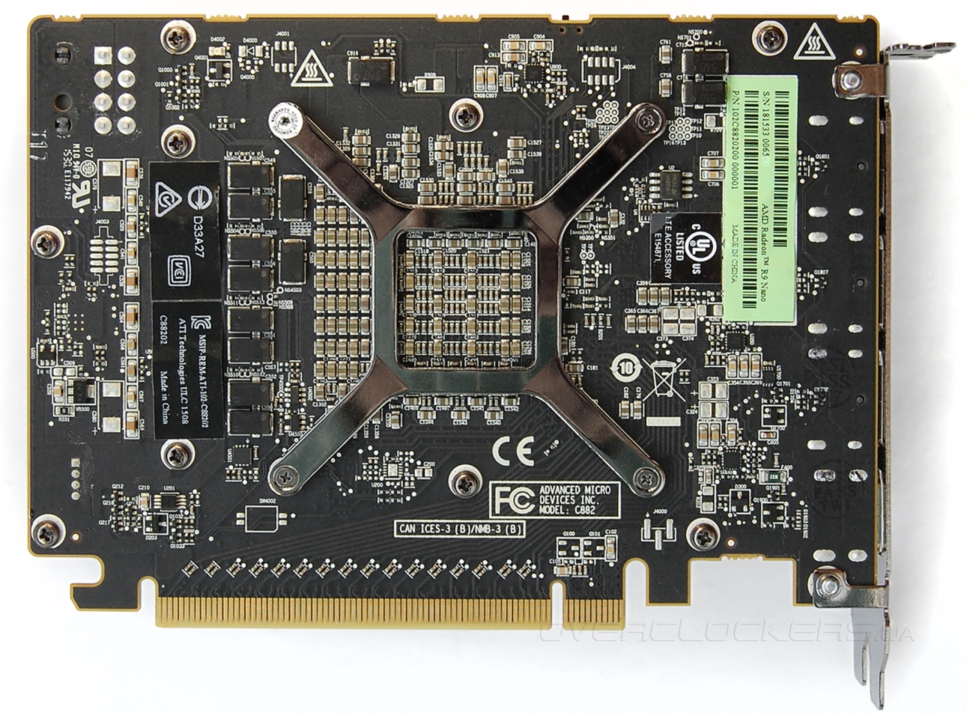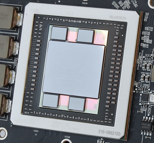 На подложку нанесен проводниковый слой Interposer, связывающий кристалл графического процессора и банки памяти. Все это обильно смазано термопастой для надежного контакта с основанием кулера.