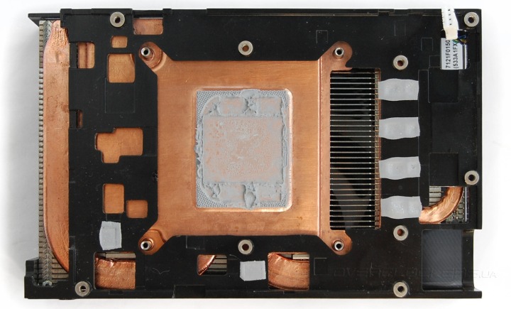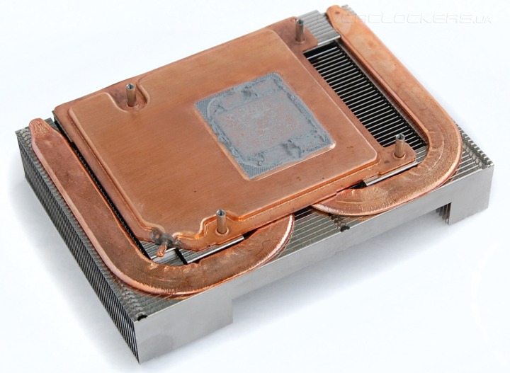 При близком осмотре медное основание оказывается испарительной камерой с двумя приплюснутыми тепловыми трубками на его поверхности. Испарительная камера отводит тепло от кристалла GPU и модулей памяти, трубки разносят его по всему радиатору, который набран из плотно подогнанных друг к другу пластин.