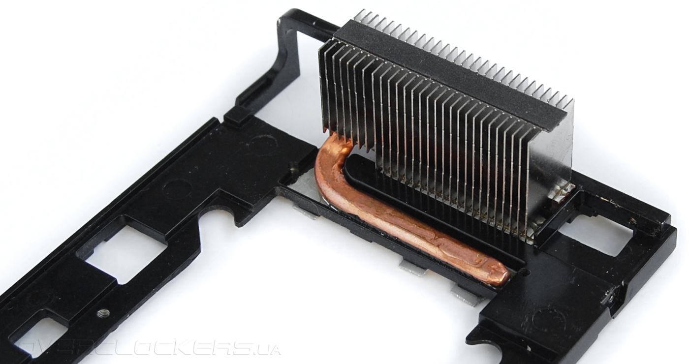 Не менее солидное охлаждение у элементов питающей цепи. Черная пластина имеет небольшую тепловую трубку в месте их расположения. Трубка несет на себе массив тонких пластин.