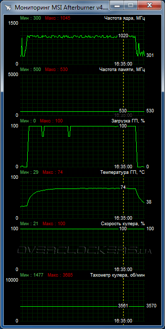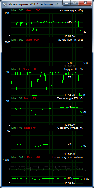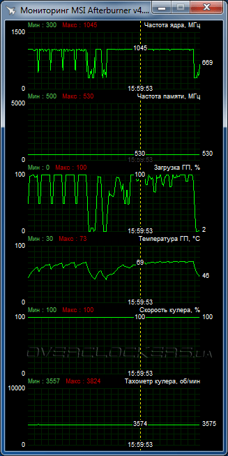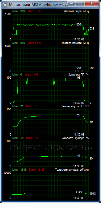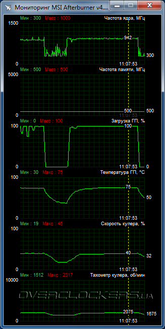 Частотные характеристики соответствуют стандартным: GPU работает на 1000 МГц, частота памяти 500 МГц (эффективное значение 1000 МГц).