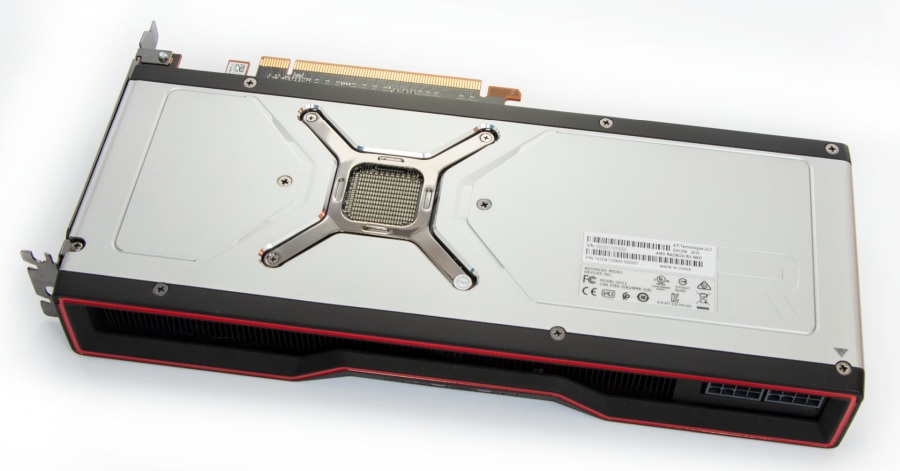 Боковая грань корпуса имеет красную окантовку и красный подсвечиваемый логотип Radeon. В углу расположено два разъема питания по восемь контактов.