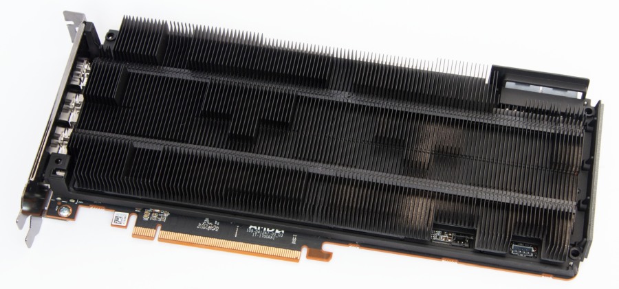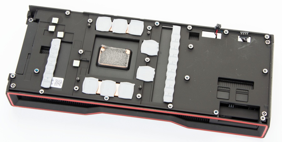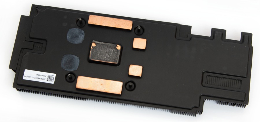 Ребра радиатора напаяны на крупную испарительную камеру, которая работает по принципу большой тепловой трубки. На фото ниже хорошо видно, что основной радиатор предназначен для контакта с GPU и микросхемами памяти через специальные площадки. Вместо термопасты для графического процессора используется графеновая термопрокладка.