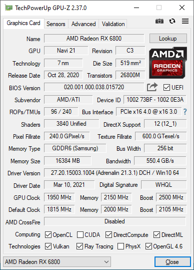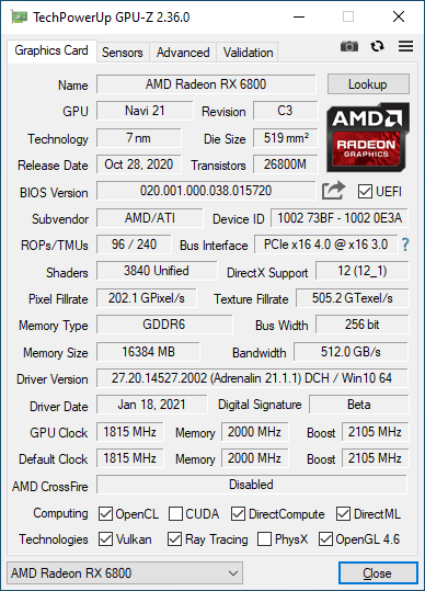 Стандартные спецификации предусматривают для Radeon RX 6800 базовую частоту ядра 1700 МГц при Game Clock 1815 МГц и Boost Clock 2150 МГц.