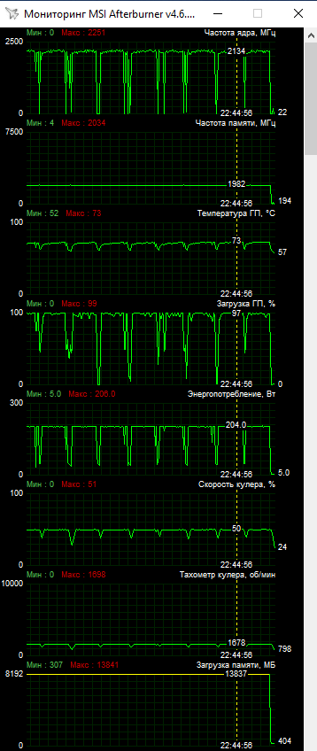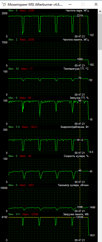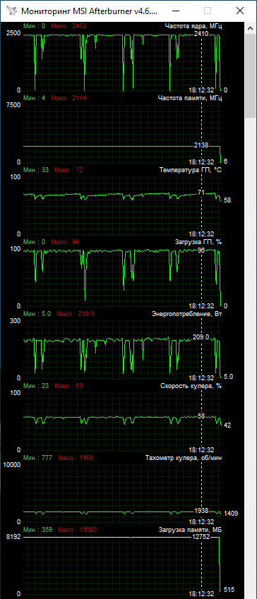 Во многих играх частота GPU приближалась к 2200 МГц, в тяжелых приложениях при высоких разрешениях держалась в рамках 2100–2200 МГц. Ниже это проиллюстрировано на скриншотах мониторинга MSI Afterburner в Horizon Zero Dawn и The Division 2 при разрешении 4K.