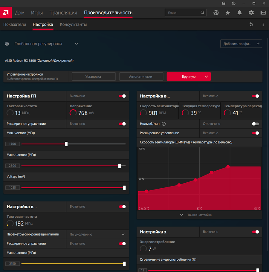 Что касается разгона, то все операции лучше осуществлять через встроенные функции в программном обеспечении AMD Adrenalin Edition. Тут можно плавно регулировать диапазон частот GPU, подбирать меньшие напряжения, задавать свой алгоритм управления вентиляторами т.п. Конфигурация настроек для нашей видеокарты отражена ниже.