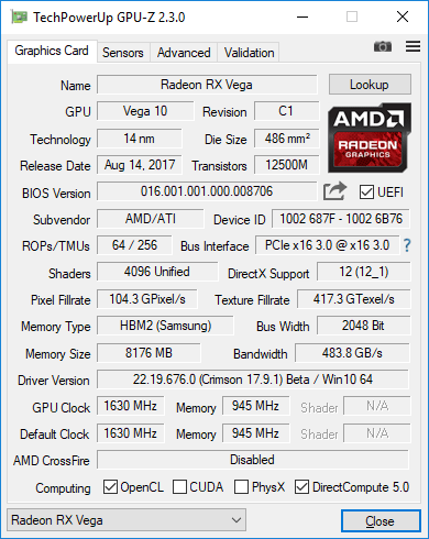 AMD немного изменила систему частотных характеристик. Теперь указывается базовое значение и среднеигровое значение Boost-частоты. Для Radeon RX Vega 64 это 1274 и 1546 МГц соответственно. Максимально возможное значение достигает 1630 МГц, и именно это значение отображается в утилите GPU-Z. Тактовая частота банков памяти 945 МГц при эффективной DDR-частоте 1890 МГц.