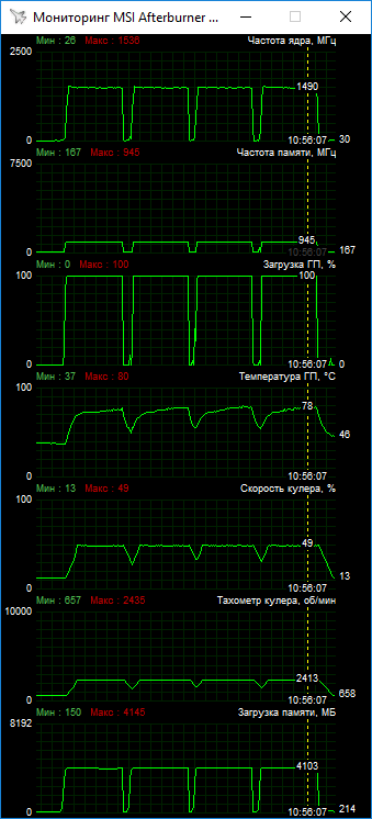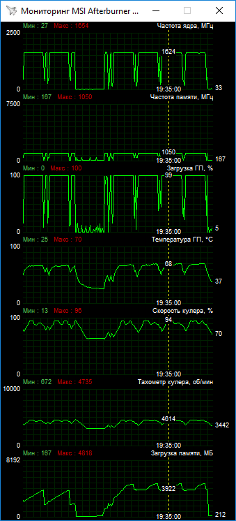 При наших установках пиковое значение частоты выросло до 1672 МГц. Реальная частота в Boost-режиме держалась на уровне 1620–1630 МГц практически во всех тестах. То есть итоговый прирост по частоте будет не 2,5%, а на уровне 8–10% относительно частот в номинале.